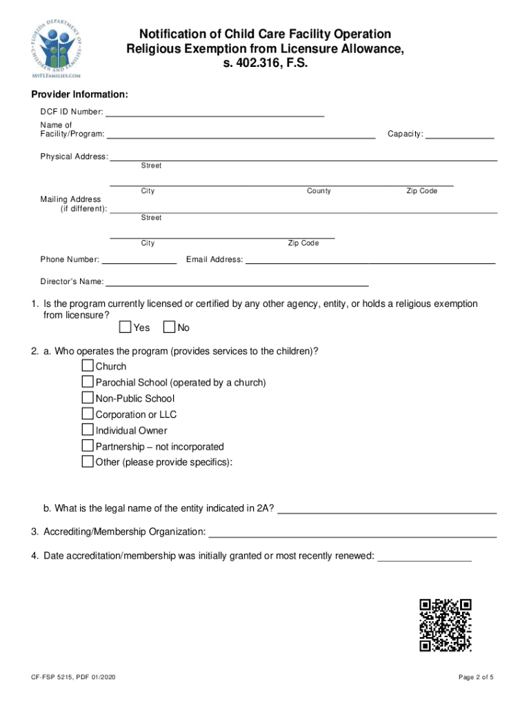 Notification of Child Care Facility Operation Religious Exemption from Licensure Allowance, s. 402.316, F.S. Press space bar (or left mouse click) to check a box; press space bar (or left mouse click)