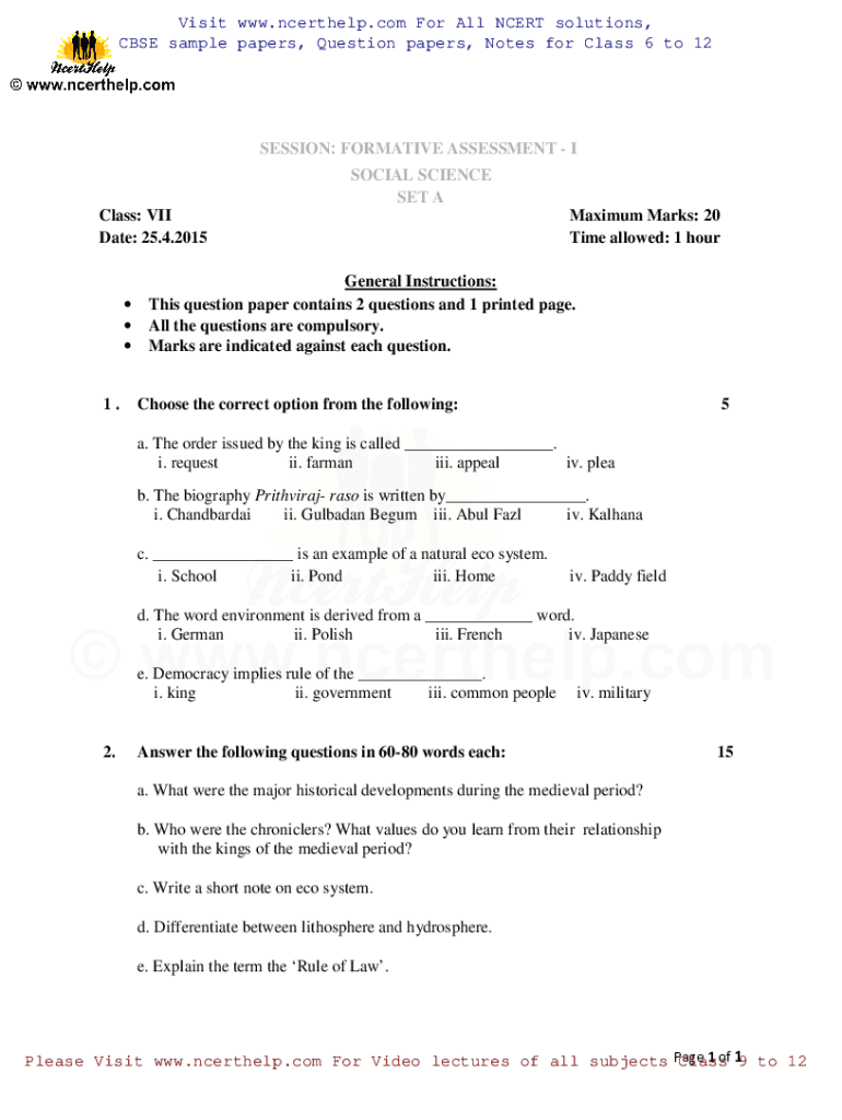 Visit www.ncerthelp.com For All CERT solutions, CBSE sample papers, Question papers, Notes for Class 6 to 12SESSION: FORMATIVE ASSESSMENT I SOCIAL SCIENCE SET A Class: VII Date: 25.4.2015 1. Maximum