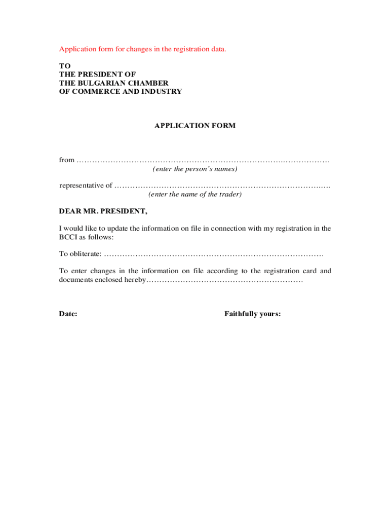 Application form for changes in the registration data. TO THE PRESIDENT OF THE BULGARIAN CHAMBER OF COMMERCE ND INDUSTRYAPPLICATION FORM from. (enter the persons names) representative of. (enter the