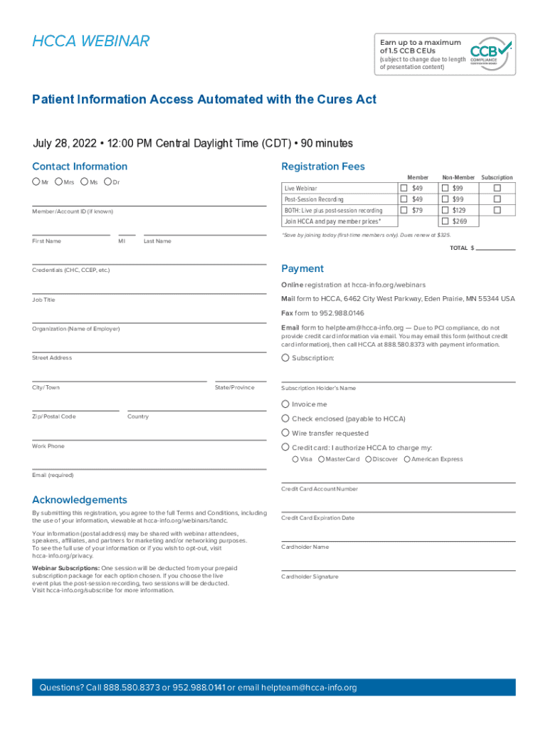 CCA WEBINAREarn up to a maximum of 1.5 CCB Zeus (subject to change due to length of presentation content)Patient Information Access Automated with the Cures Act July 28, 2022 12:00 PM Central Daylight