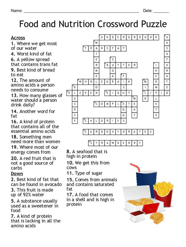 Name: ___ Date: ___Food and Nutrition Crossword Puzzle Across 1. Where we get most of our water 4. The Worst kind of fat 6. A yellow spread that contains trans fat 9. The Best kind of bread to eat