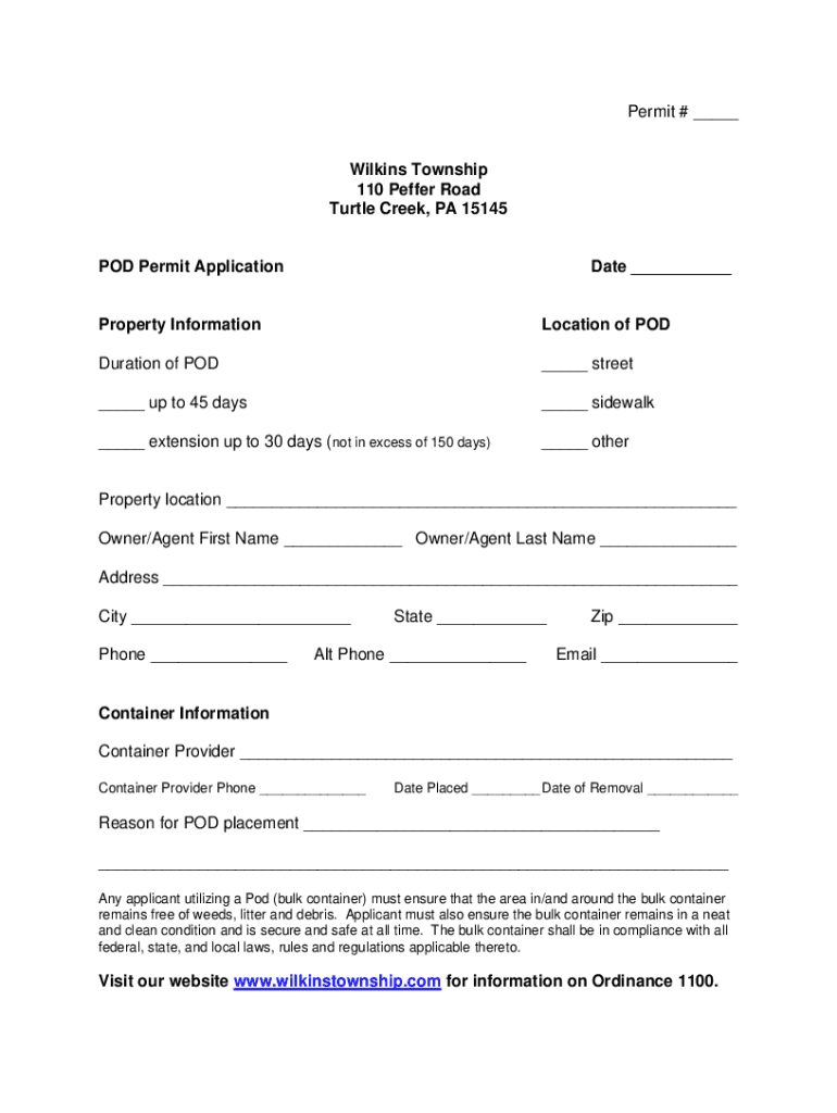 Permit # ___Wilkins Township 110 Puffer Road Turtle Creek, PA 15145POD Permit ApplicationDate ___Property InformationLocation of Population of POD___ street___ up to 45 days___ sidewalk___ extension