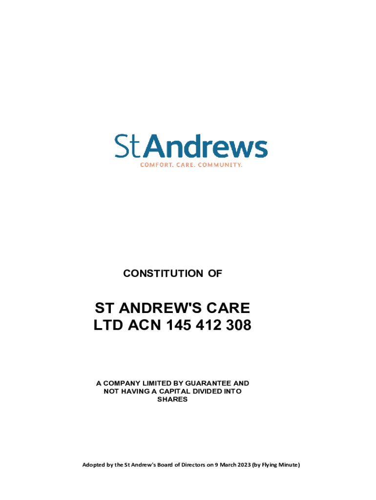 CONSTITUTION OFT ANDREW\'S CARE LTD ACN 145 412 308A COMPANY LIMITED BY GUARANTEE AND NOT HAVING A CAPITAL DIVIDED INTO SHARESAdopted by the St Andrew\'s Board of Directors on 9 March 2023 (by Flying