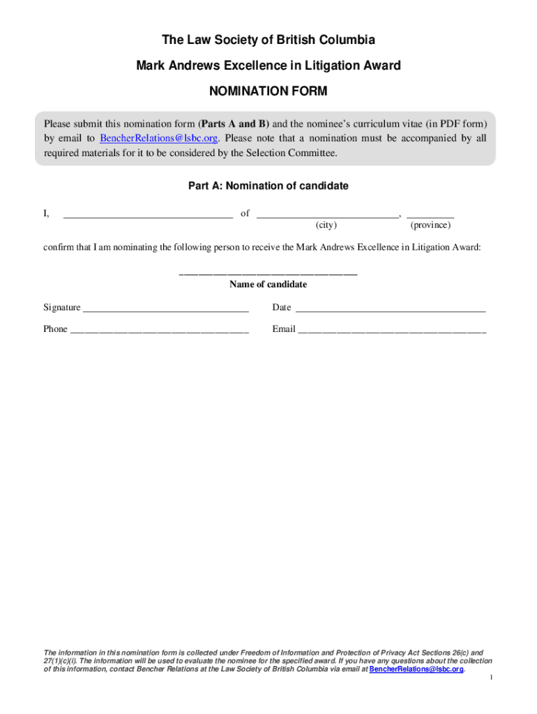The Law Society of British Columbia Mark Andrews Excellence in Litigation Award NOMINATION FORM Please submit this nomination form (Parts A and B) and the nominees' curriculum vitae (in PDF form)