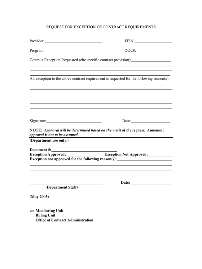 REQUEST FOR EXCEPTION to CONTRACT REQUIREMENTSProvider:___VEIN:___Program:___DOC#:___Contract Exception Requested (cite specific contract provision):___ ___ ___ ___ An exception to the above contract