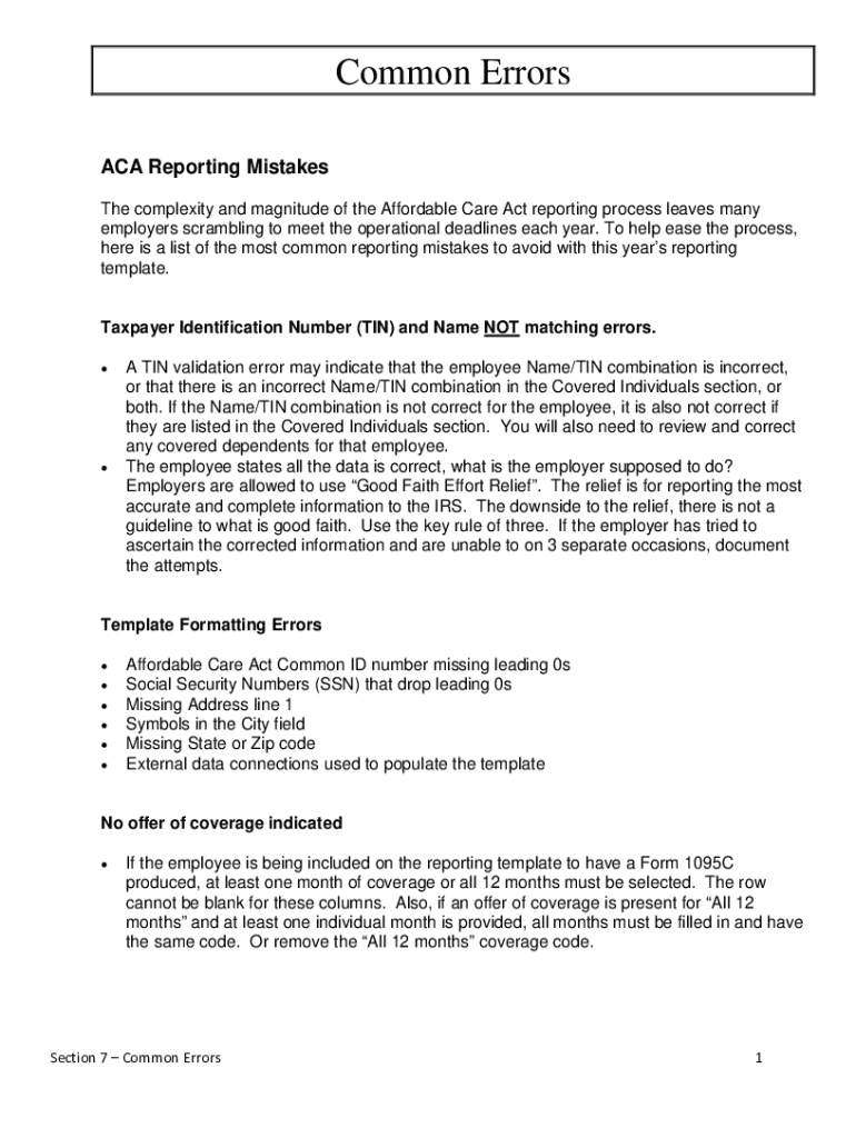 Common Errors ACA Reporting Mistakes The complexity and magnitude of the Affordable Care Act reporting process leaves many employers scrambling to meet the operational deadlines each year. To help