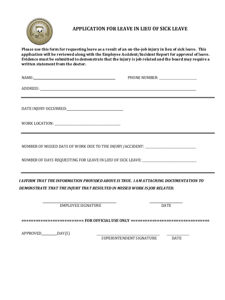 APPLICATION FOR LEAVE IN LIEU OF SICK LEAVEPlease use this form for requesting leave as a result of an onthejob injury in lieu of sick leave. This application will be reviewed along with the Employee