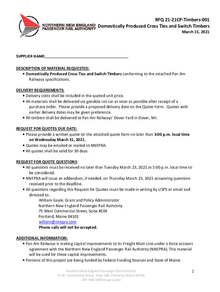 RFQ 2121CPTimbers001 Domestically Produced Cross Ties and Switch Timbers March 15, 2021SUPPLIER NAME: ___DESCRIPTION OF MATERIAL REQUESTED: Domestically Produced Cross Ties and Switch Timbers conforming