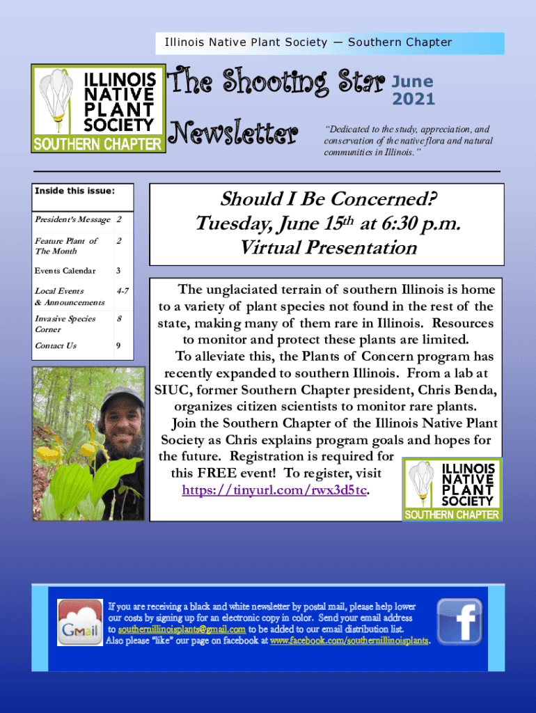 Illinois Native Plant Society Southern Chapter Shooting Star June 2021 Newsletter Inside this issue:Presidents Message 2 Feature Plant of The Month2Events Calendar3Local Events & Announcements47Invasive