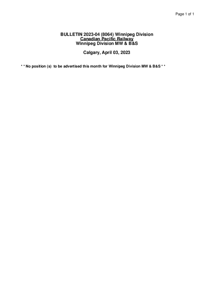 Page 1 of 1BULLETIN 202304 (8064) Winnipeg Division Canadian Pacific Railway Winnipeg Division MW & B&S Calgary, April 03, 2023 * * No position (s) to be advertised this month for Winnipeg Division