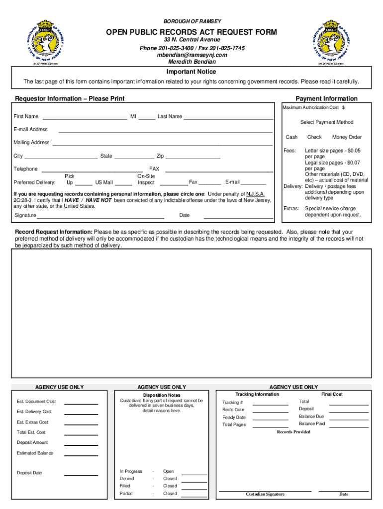 BOROUGH OF RAMSEYOPEN PUBLIC RECORDS ACT REQUEST FORM 33 N. Central Avenue Phone 2018253400 / Fax 2018251745 mbendian@ramseynj.com Meredith BendianImportant Notice The last page of this form contains