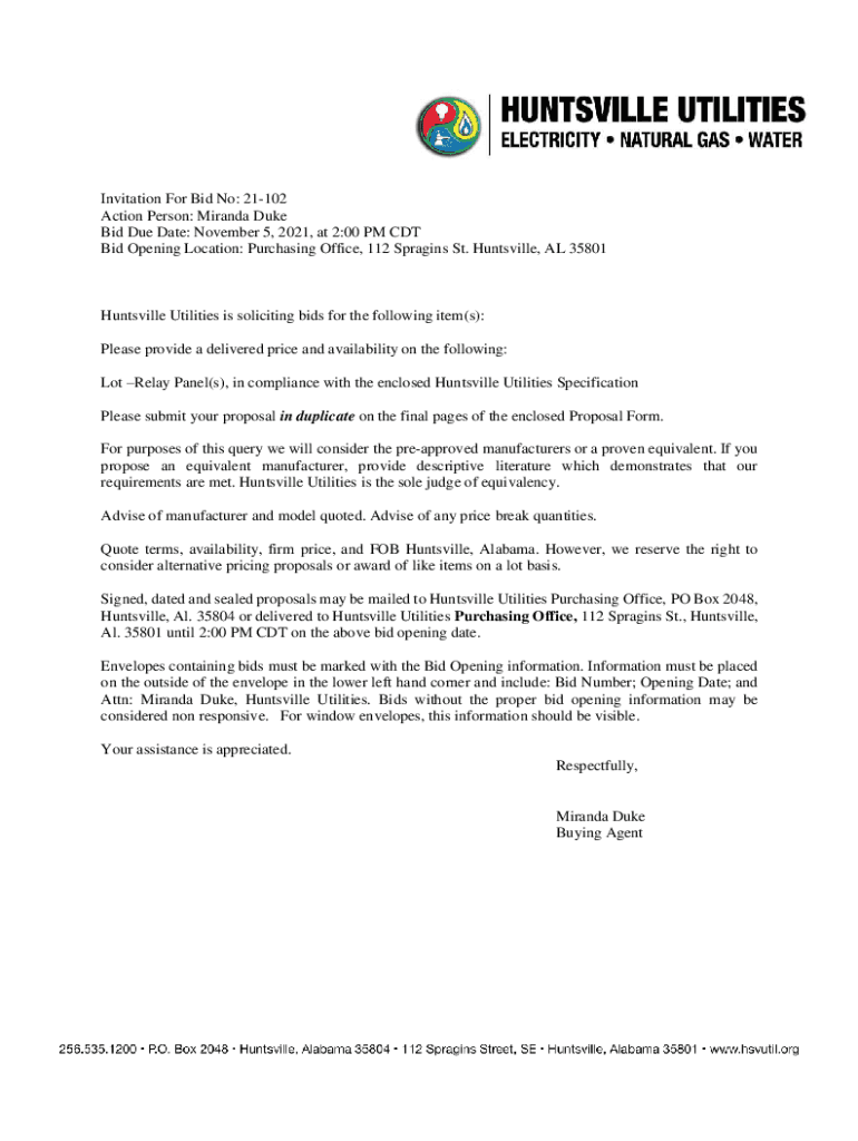 Invitation For Bid No: 21102 Action Person: Miranda Duke Bid Due Date: November 5, 2021, at 2:00 PM CDT Bid Opening Location: Purchasing Office, 112 Sprains St. Huntsville, AL 35801Huntsville Utilities