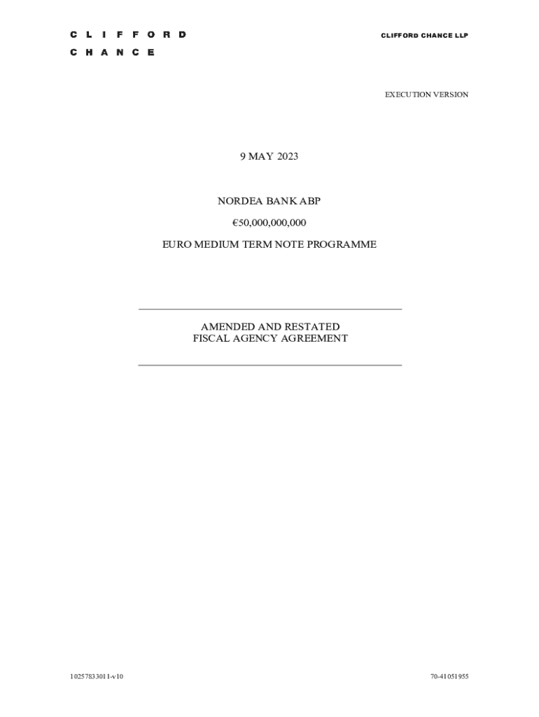 CLIFFORD CHANCE EXECUTION VERSION9 MAY 2023NORDEA BANK ABP 50,000,000,000 EURO MEDIUM TERM NOTE PROGRAMMEAMENDED AND RESTATED FISCAL AGENCY AGREEMENT10257833011v107041051955CONTENTS ClausePage1. Interpretation