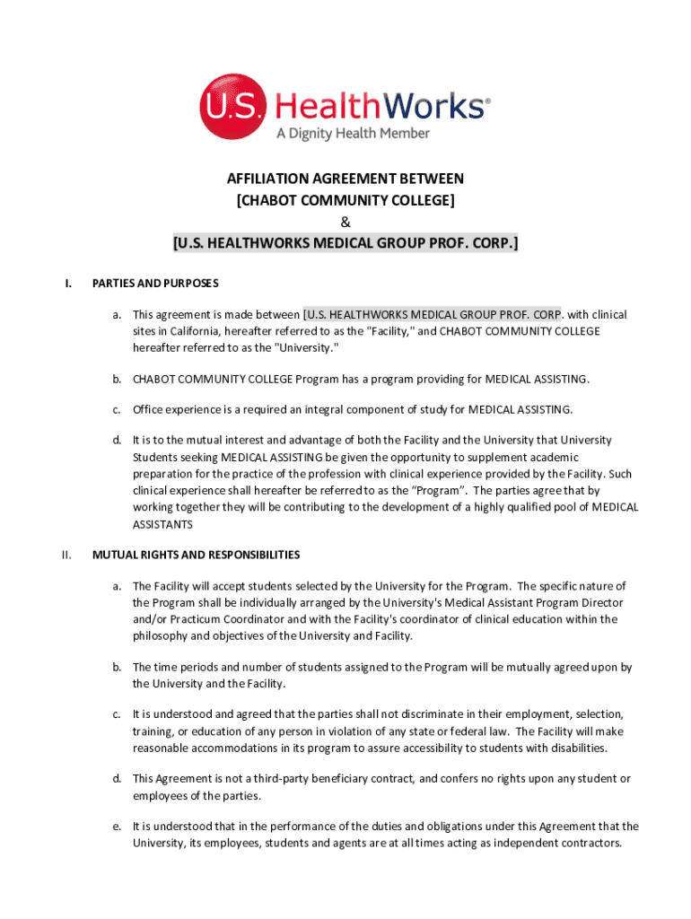 AFFILIATION AGREEMENT BETWEEN [CABOT COMMUNITY COLLEGE] & [U.S. EARTHWORKS MEDICAL GROUP PROF. CORP.] I.PARTIES AND PURPOSES a. This agreement is made between [U.S. EARTHWORKS MEDICAL GROUP PROF.