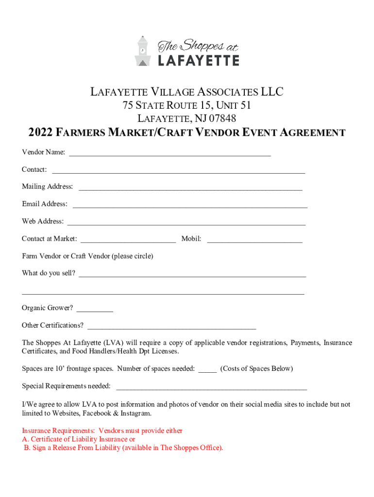 LAFAYETTE VILLAGE ASSOCIATES LLC 75 STATE ROUTE 15, UNIT 51 LAFAYETTE, NJ 078482022 FARMERS MARKET/CRAFT VENDOR EVENT AGREEMENT Vendor Name: ___ Contact: ___ Mailing Address: ___ Email Address: ___