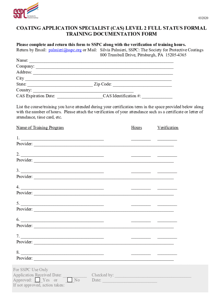 032820COATING APPLICATION SPECIALIST (CAS) LEVEL 2 FULL STATUS FORMAL TRAINING DOCUMENTATION FORM Please complete and return this form to SSP along with the verification of training hours. Return