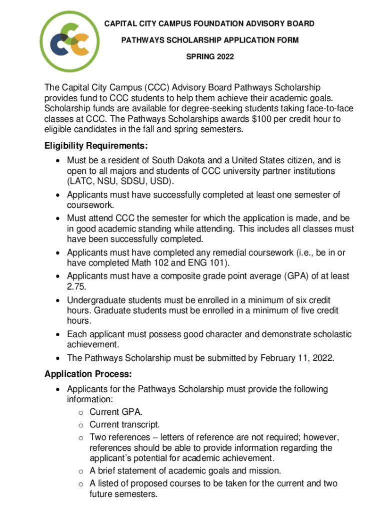 CAPITAL CITY CAMPUS FOUNDATION ADVISORY BOARD PATHWAYS SCHOLARSHIP APPLICATION FORM SPRING 2022The Capital City Campus (CCC) Advisory Board Pathways Scholarship provides fund to CCC students to help