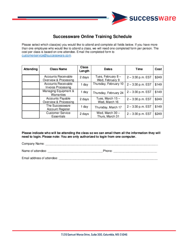 Success ware Online Training Schedule Please select which class(BS) you would like to attend and complete all fields below. If you have more than one employee who would like to attend a class, we