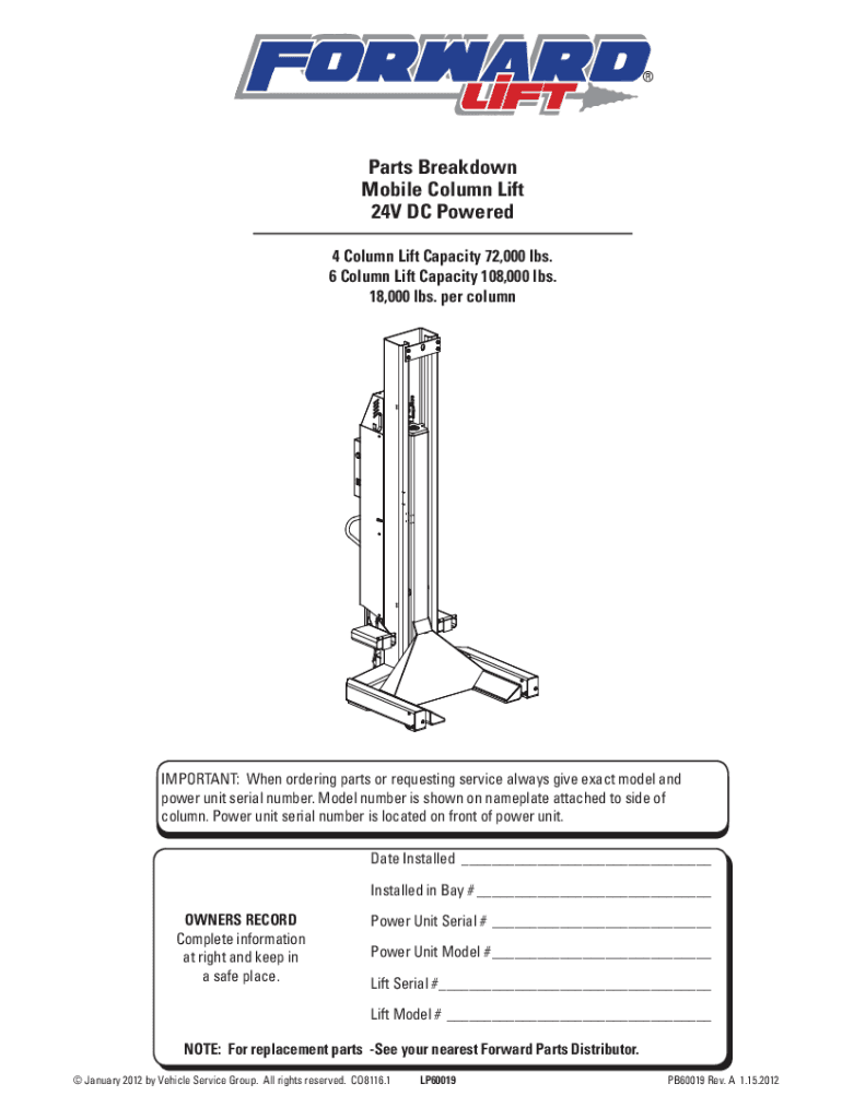 Parts Breakdown Mobile Column Lift 24V DC Powered 4 Column Lift Capacity 72,000 lbs. 6 Column Lift Capacity 108,000 lbs. 18,000 lbs. per columnIMPORTANT: When ordering parts or requesting service