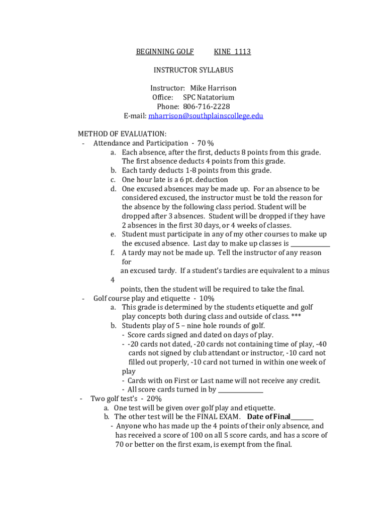 BEGINNING GOLFING 1113INSTRUCTOR SYLLABUSInstructor: Mike Harrison Office: SPC Sanatorium Phone: 8067162228 Email: mharrison@southplainscollege.eduMETHOD OF EVALUATION: Attendance and Participation