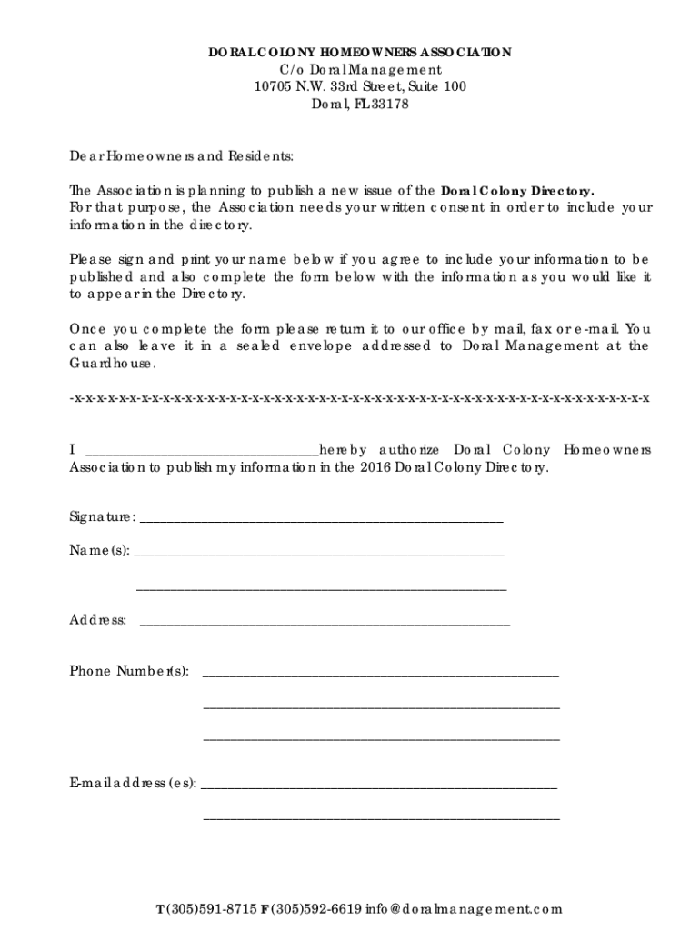 COLONY HOMEOWNERS ASSOCIATION C/o Management 10705 N.W. 33rd Street, Suite 100, FL 33178 Dear Homeowners and Residents: The Association is planning to publish a new issue of the Colony Directory.