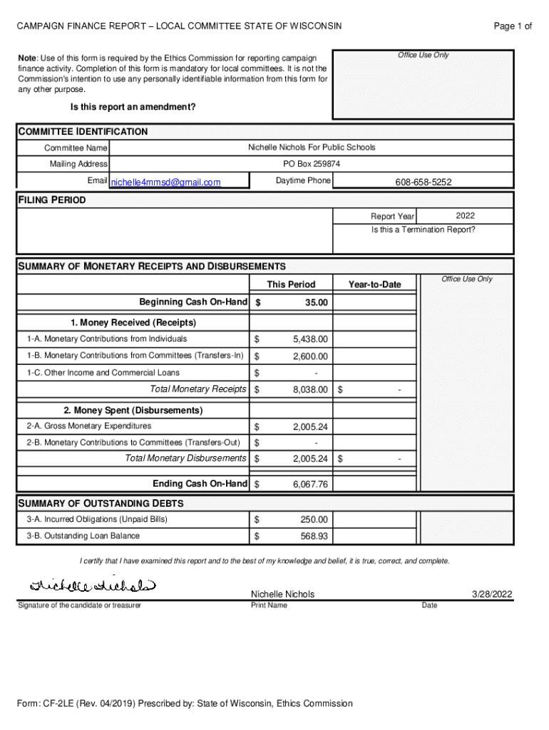 CAMPAIGN FINANCE REPORT LOCAL COMMITTEE STATE OF Wisconsinite 1 of Office Use OneNote: Use of this form is required by the Ethics Commission for reporting campaign finance activity. Completion of