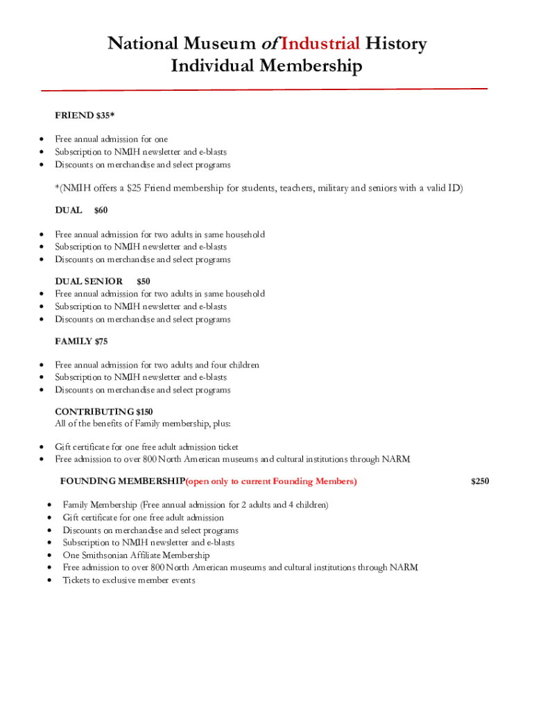 National Museum of Industrial History Individual Membership FRIEND $35* Free annual admission for one Subscription to NIH newsletter and blasts Discounts on merchandise and select programs*(NIH offers