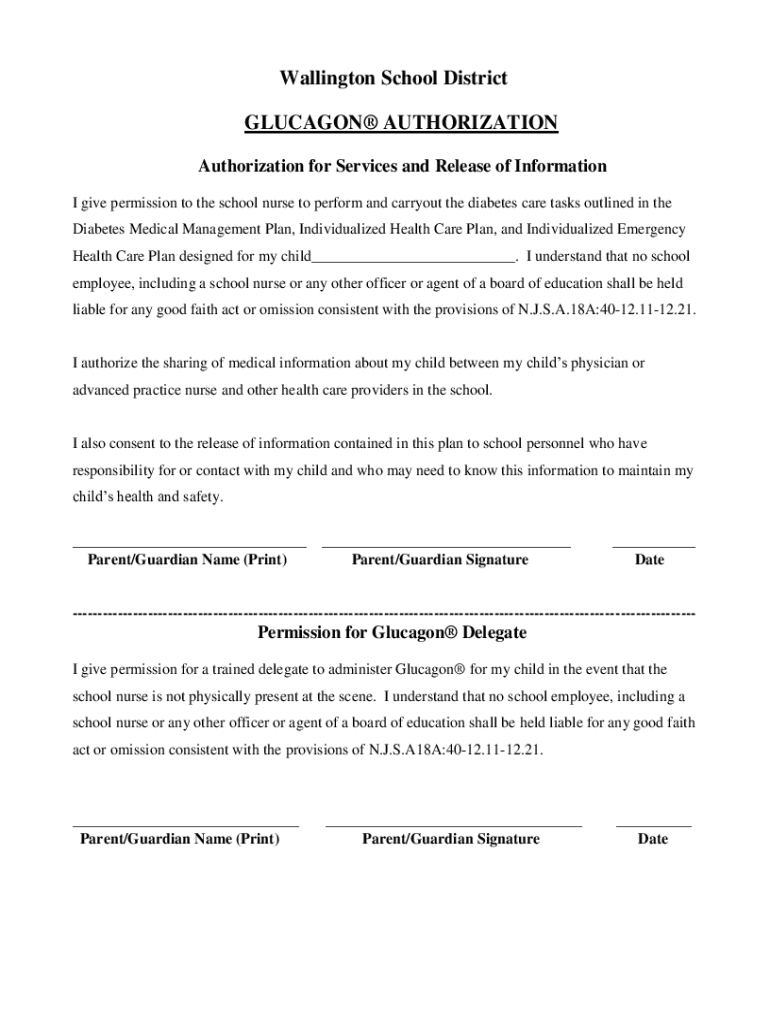 Wellington School District GLUCAGON AUTHORIZATION for Services and Release of Information I give permission to the school nurse to perform and carryout the diabetes care tasks outlined in the Diabetes