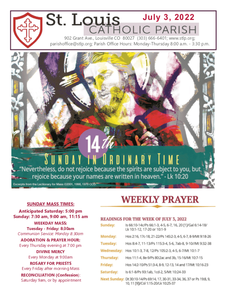 July 3, 2022 902 Grant Ave., Louisville CO 80027 (303) 6666401; www.stlp.org; parishoffice@stlp.org; Parish Office Hours: Monday Thursday 8:00 a.m. 3:30 p.m.SUNDAY MASS TIMES: Anticipated Saturday: