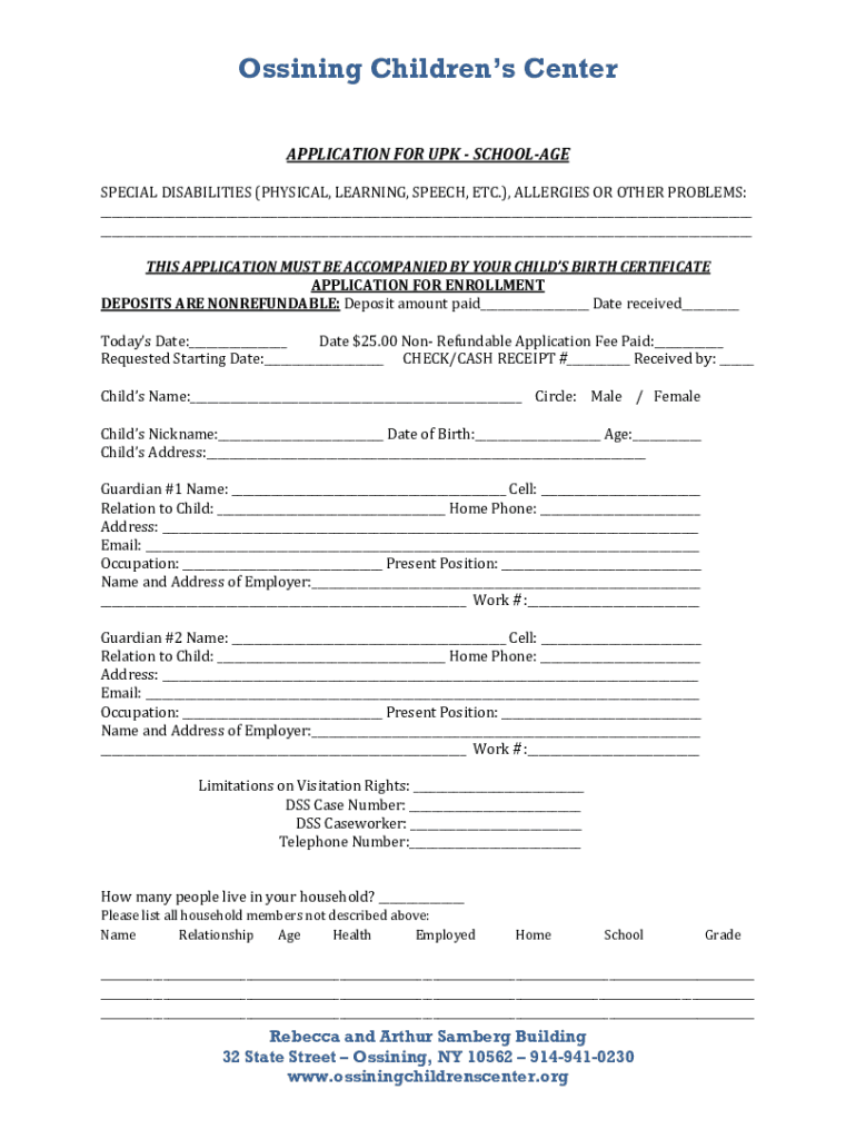 Assigning Children's Center APPLICATION FOR UPK SCHOOL AGE SPECIAL DISABILITIES (PHYSICAL, LEARNING, SPEECH, ETC.), ALLERGIES OR OTHER PROBLEMS: ___ ___ THIS APPLICATION MUST BE ACCOMPANIED BY YOUR