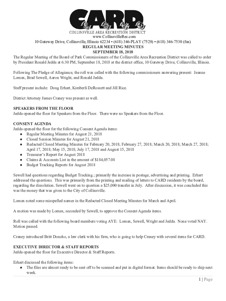 WWW.CollinsvilleRec.com 10 Gateway Drive, Collinsville, Illinois 62234 (618) 346PLAY (7529) (618) 3467530 (fax) REGULAR MEETING MINUTES SEPTEMBER 18, 2018, The Regular Meeting of the Board of Park
