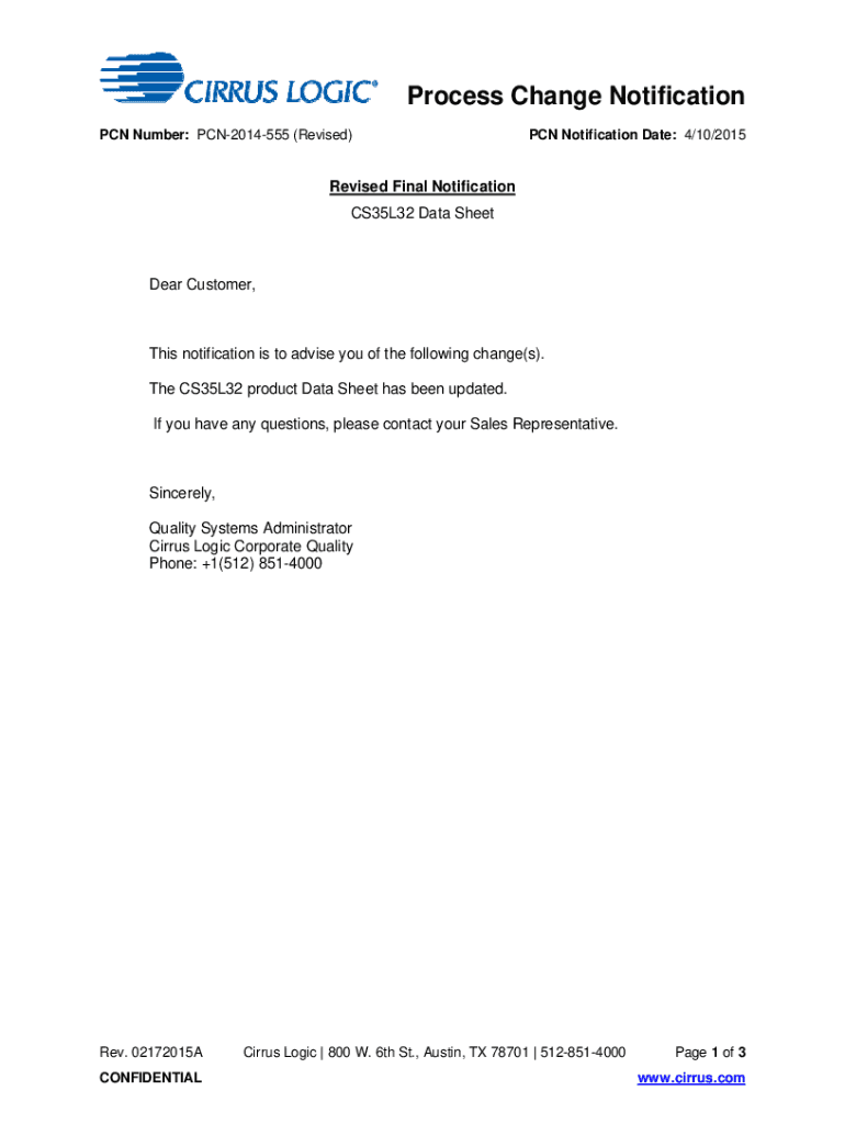 Process Change Notification PCN Number: PCN2014555 (Revised)PCN Notification Date: 4/10/2015Revised Final Notification CS35L32 Data Speedier Customer, This notification is to advise you of the following