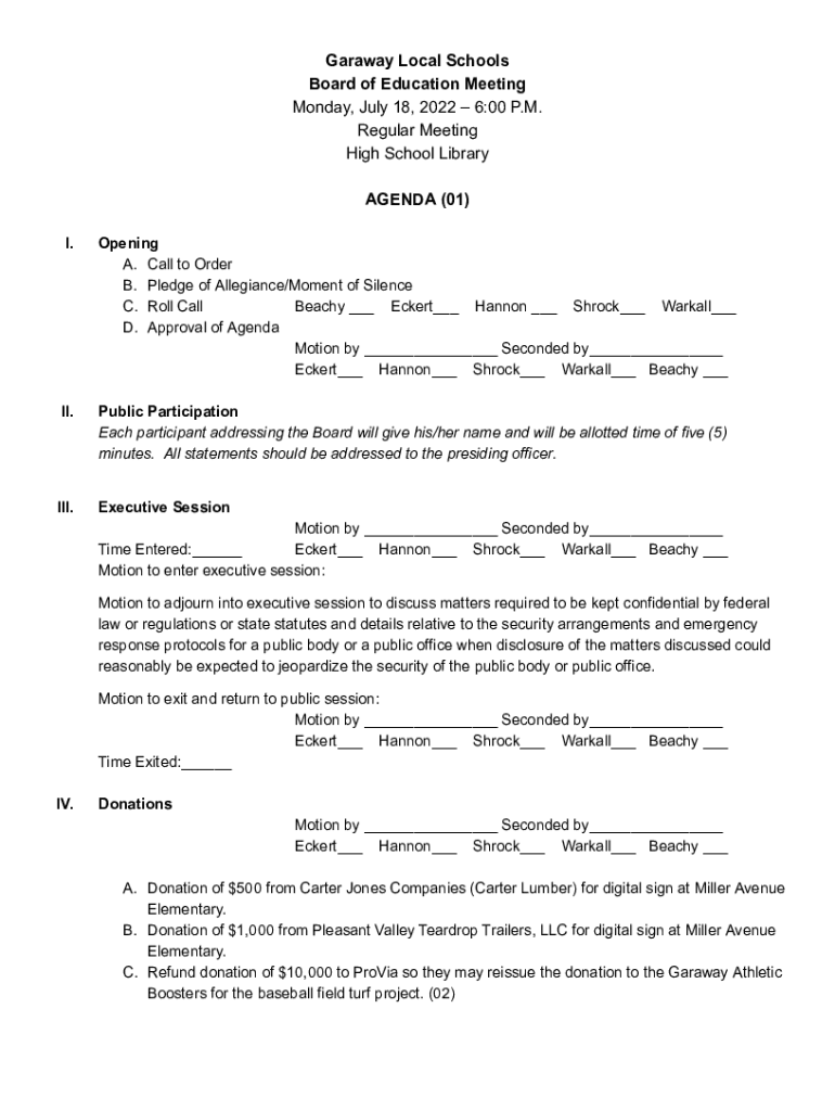 Faraway Local Schools Board of Education Meeting Monday, July 18, 2022 6:00 P.M. Regular Meeting High School Library AGENDA (01) I. Opening A. Call to Order B. Pledge of Allegiance/Moment of Silence