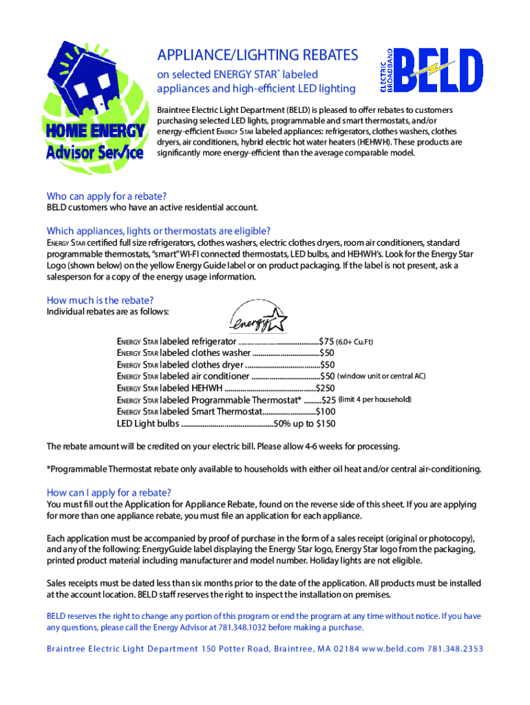 APPLIANCE/LIGHTING REBATES on selected ENERGY STAR labeled appliances and high efficient LED lighting Braintree Electric Light Department (HELD) is pleased to offer rebates to customers purchasing