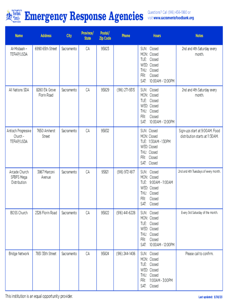 Emergency Response Agencies NameAddressCityProvince/ StatePostal/ Zip CodeAlMisbaah TEF AP/USDA6990 65th StreetSacramentoCA95823All Nations SDA8280 Elk Grove Florin RoadSacramentoCA95829Antioch Progressive