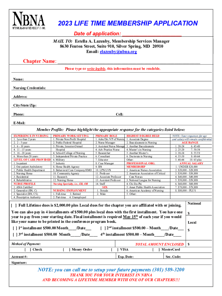 2023 Lifetime MEMBERSHIP APPLICATION Date of application: ___ MAIL TO: Estella A. Latency, Membership Services Manager 8630 Benton Street, Suite 910, Silver Spring, MD 20910 Email: elazenby@nbna.orgChapter