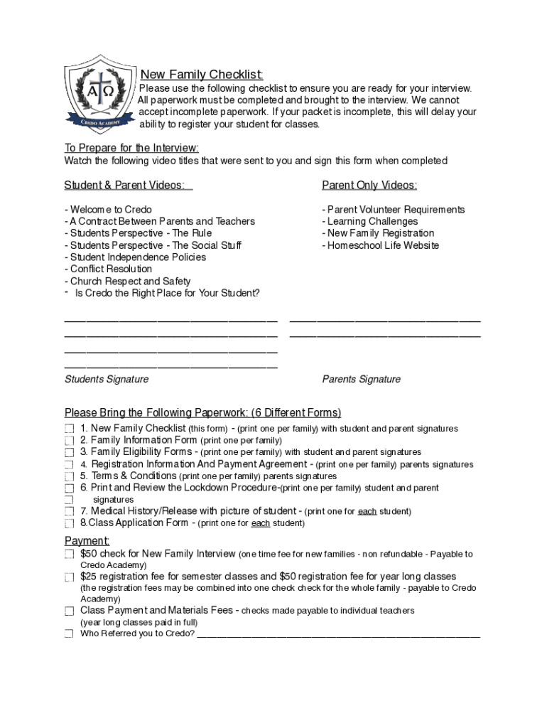 New Family Checklist: Please use the following checklist to ensure you are ready for your interview. All paperwork must be completed and brought to the interview. We cannot accept incomplete paperwork.
