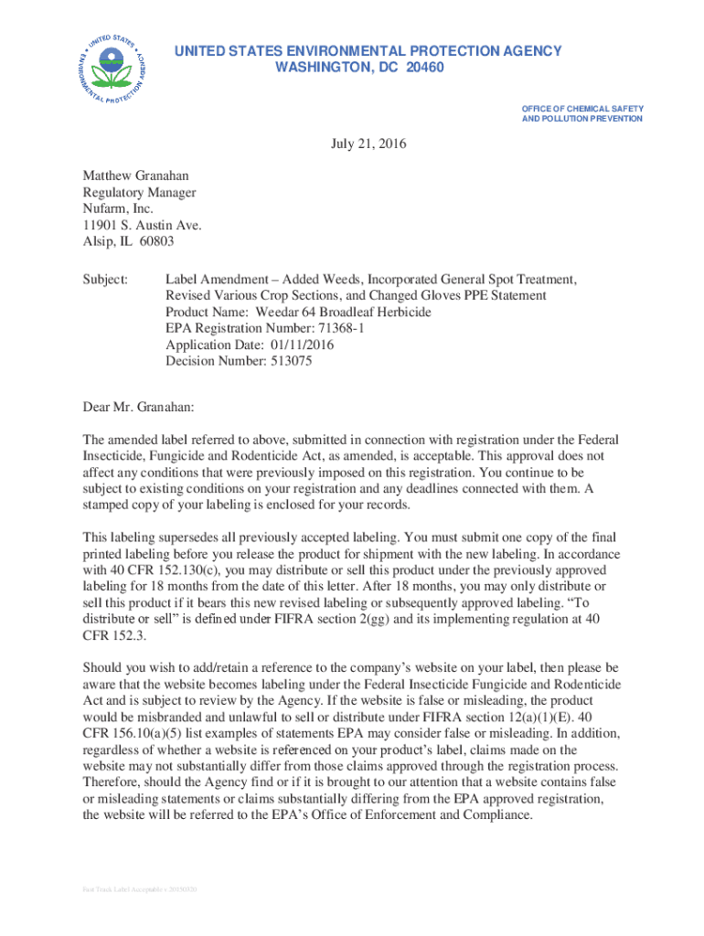 UNITED STATES ENVIRONMENTAL PROTECTION AGENCY WASHINGTON, DC 20460 OFFICE OF CHEMICAL SAFETY AND POLLUTION PREVENTION July 21, 2016, Matthew Granada Regulatory Manager Nu farm, Inc. 11901 S. Austin