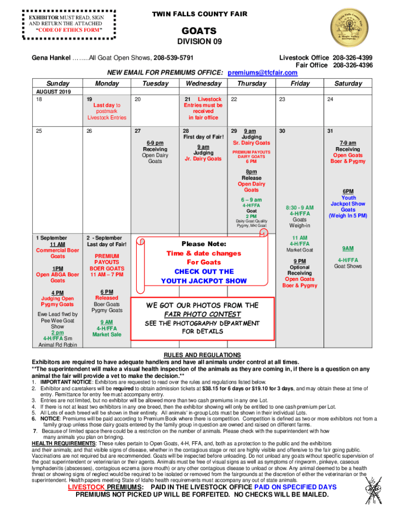 TWIN FALLS COUNTY FAIREXHIBITOR MUST READ, SIGN AND RETURN THE ATTACHED CODE OF ETHICS FORMATS DIVISION 09Gena Handel. All Goat Open Shows, 2085395791Livestock Office 2083264399 Fair Office 2083264396