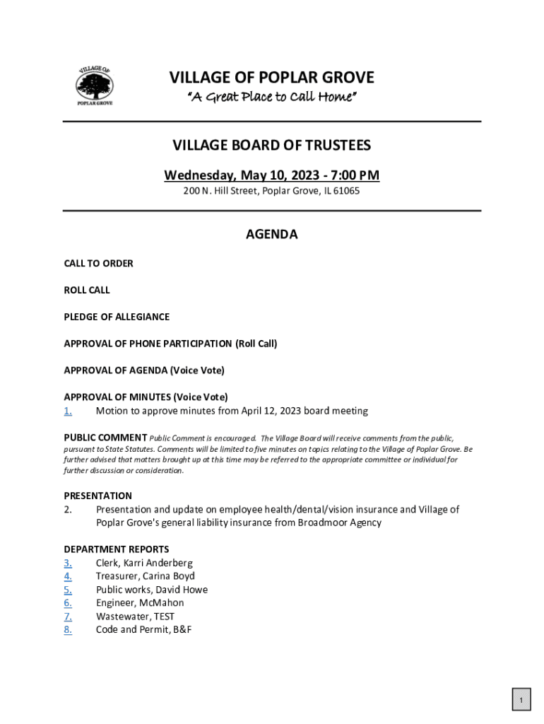 VILLAGE OF POPLAR GROVE A Great Place to Call HomeVILLAGE BOARD OF TRUSTEES Wednesday, May 10, 2023 7:00 PM 200 N. Hill Street, Poplar Grove, IL 61065AGENDA CALL TO ORDER ROLL CALL PLEDGE OF ALLEGIANCE