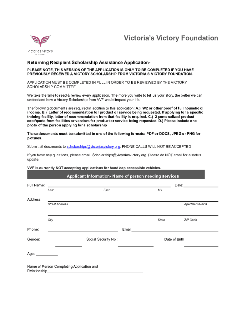 Victoria's Victory FoundationReturning Recipient Scholarship Assistance ApplicationPLEASE NOTE, THIS VERSION OF THE APPLICATION IS ONLY TO BE COMPLETED IF YOU HAVE PREVIOUSLY RECEIVED A VICTORY SCHOLARSHIP