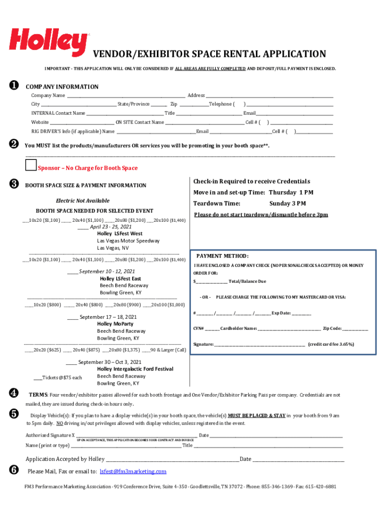VENDOR/EXHIBITOR SPACE RENTAL APPLICATION IMPORTANT THIS APPLICATION WILL ONLY BE CONSIDERED IF ALL AREAS ARE FULLY COMPLETED AND DEPOSIT/FULL PAYMENT IS ENCLOSED.COMPANY INFORMATION Company Name