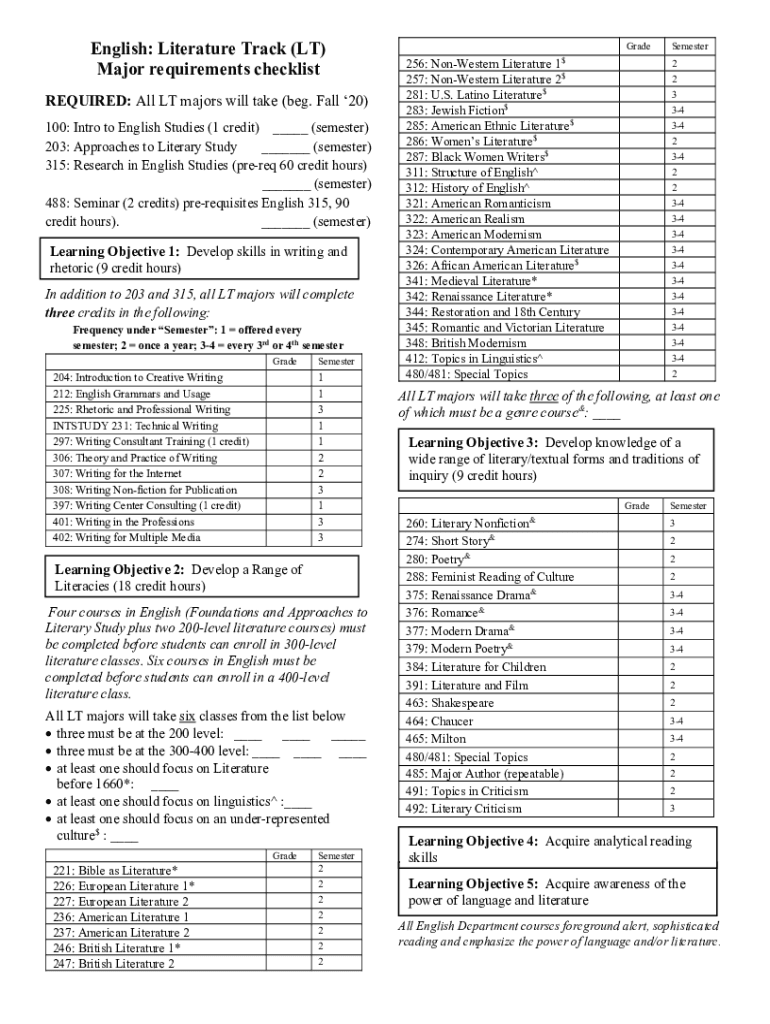 English: Literature Track (LT) Major requirements checklist REQUIRED: All LT majors will take (beg. Fall 20) 100: Intro to English Studies (1 credit) ___ (semester) 203: Approaches to Literary Study