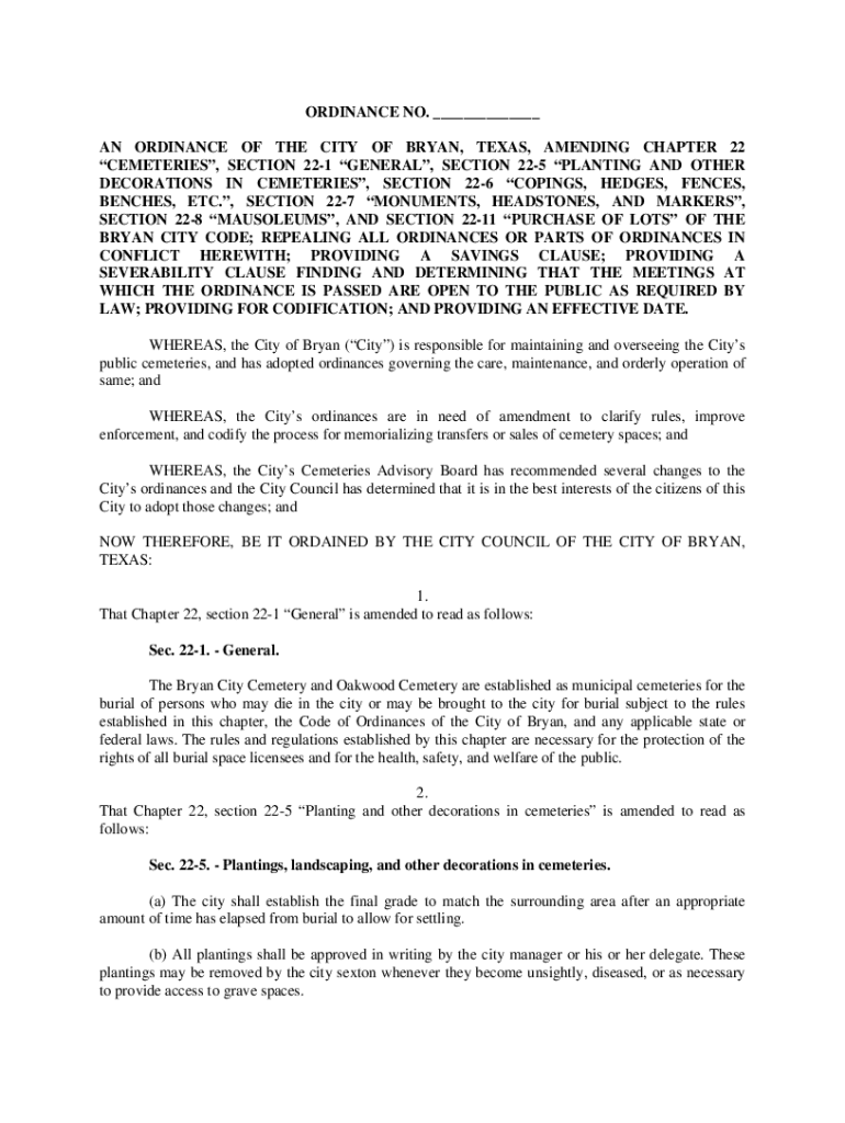 ORDINANCE NO. ___ AN ORDINANCE OF THE CITY OF BRYAN, TEXAS, AMENDING CHAPTER 22 CEMETERIES, SECTION 221 GENERAL, SECTION 225 PLANTING AND OTHER DECORATIONS IN CEMETERIES, SECTION 226 COPINGS, HEDGES,
