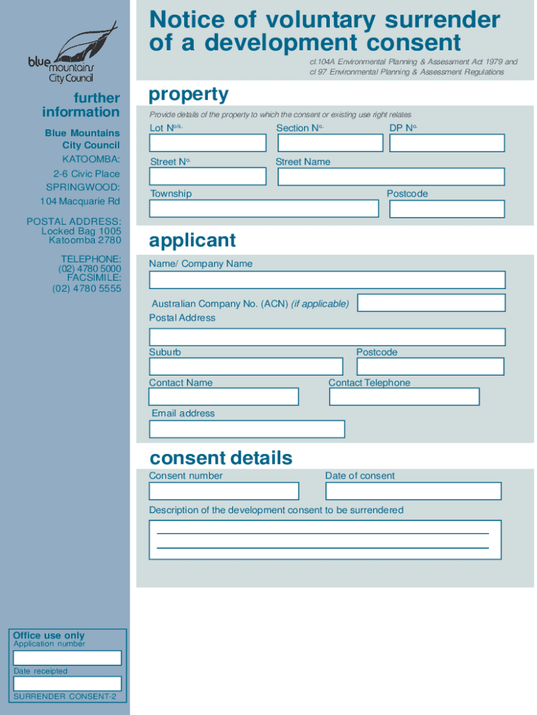 Notice of voluntary surrender of a development consent cl.104A Environmental Planning & Assessment Act 1979 and cl 97 Environmental Planning & Assessment Regulations further information Blue Mountains