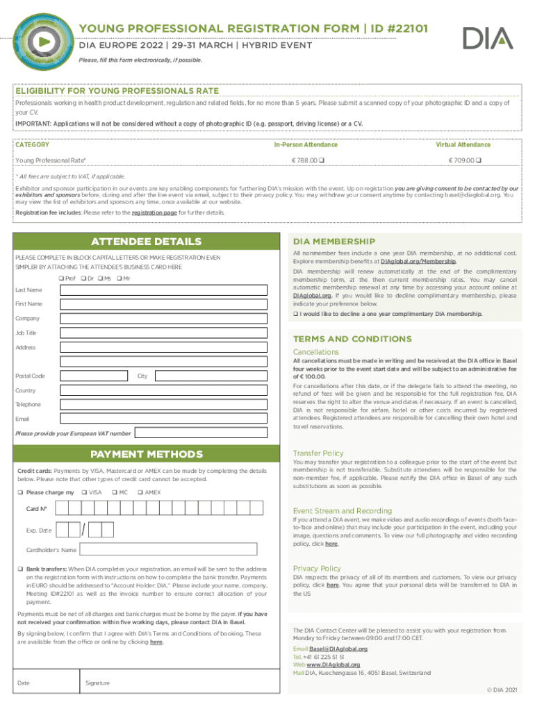 YOUNG PROFESSIONAL REGISTRATION FORM | ID #22101 DID EUROPE 2022 | 2931 MARCH | HYBRID EVENT Please, fill this form electronically, if possible. ELIGIBILITY FOR YOUNG PROFESSIONALS RATE Professionals