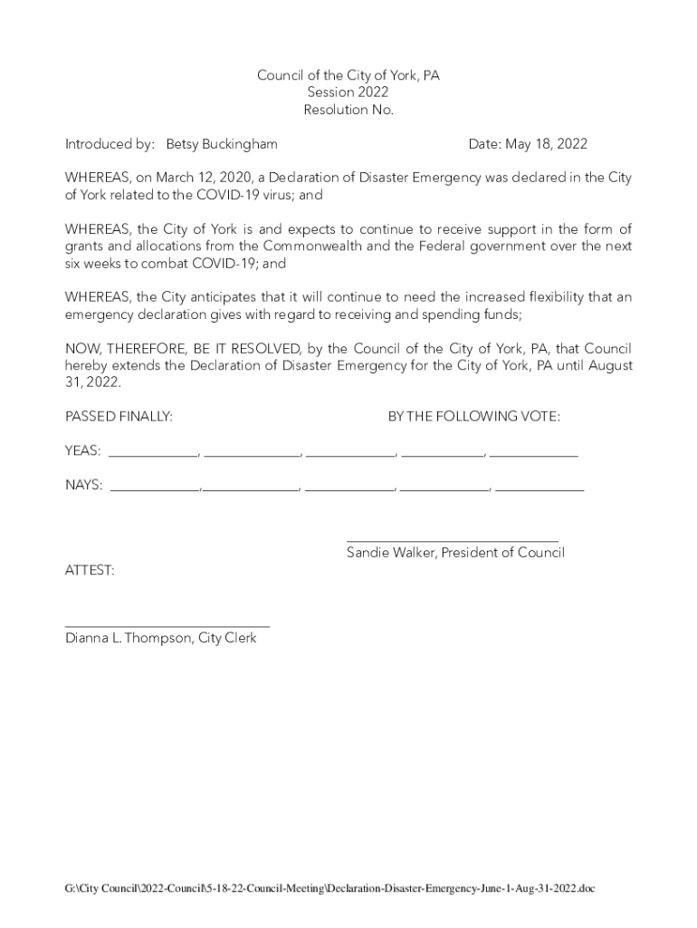 Council of the City of York, PA Session 2022 Resolution No. Introduced by: Betsy BuckinghamDate: May 18, 2022WHEREAS, on March 12, 2020, a Declaration of Disaster Emergency was declared in the City