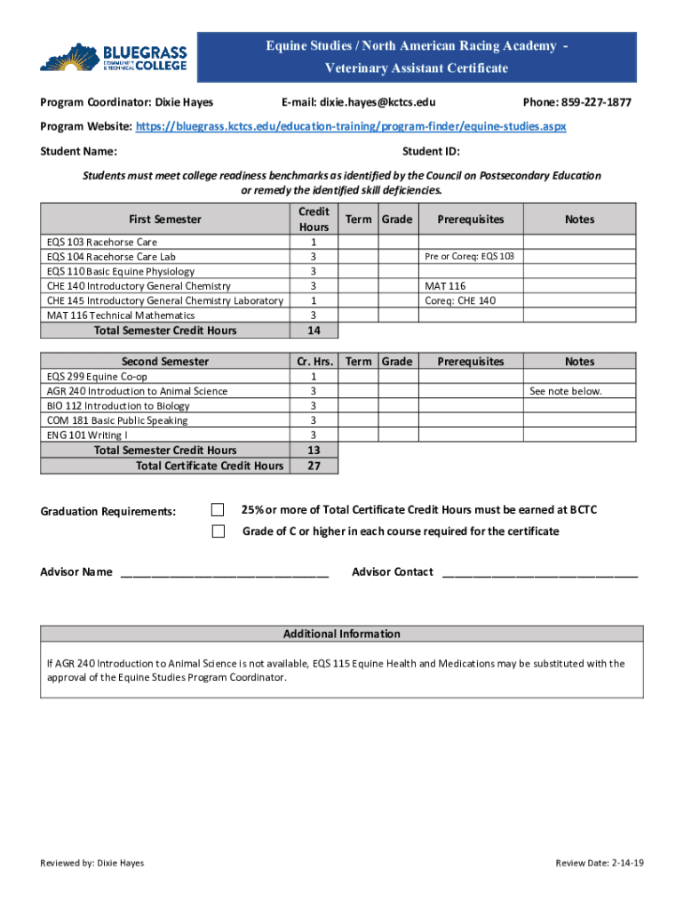 Equine Studies / North American Racing Academy Veterinary Assistant Certificate Program Coordinator: Dixie HayesEmail: dixie.hayes@kctcs.eduPhone: 8592271877Program Website: https://bluegrass.kctcs.edu/educationtraining/programfinder/equinestudies.aspx