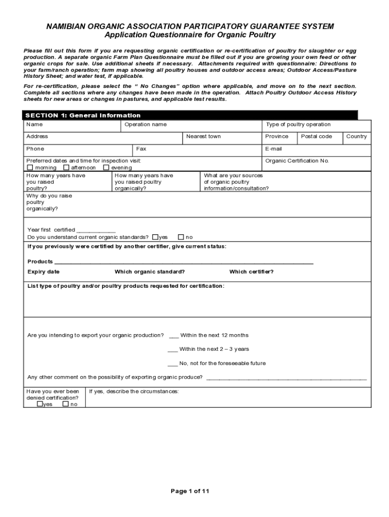 NAMIBIAN ORGANIC ASSOCIATION PARTICIPATORY GUARANTEE SYSTEM Application Questionnaire for Organic Poultry Please fill out this form if you are requesting organic certification or recertification of