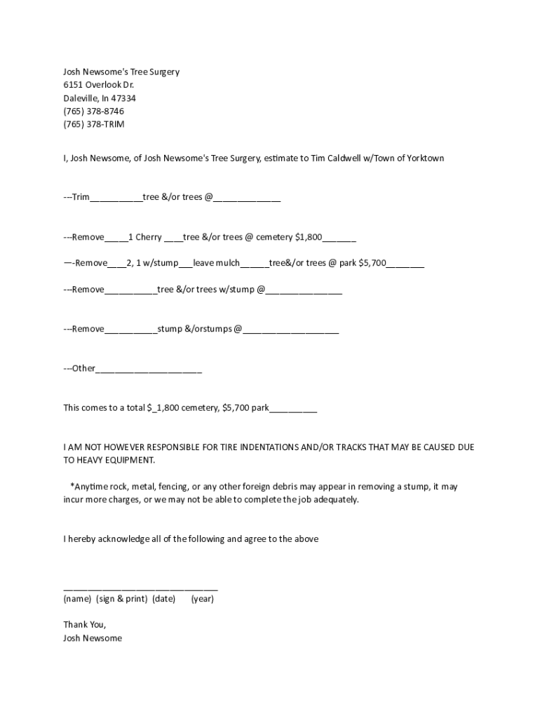 Josh Newsome\'s Tree Surgery 6151 Overlook Dr. Danville, In 47334 (765) 3788746 (765) 378TRIM I, Josh Newsome, of Josh Newsome\'s Tree Surgery, estimate to Tim Caldwell w/Town of YorktownTrim___tree